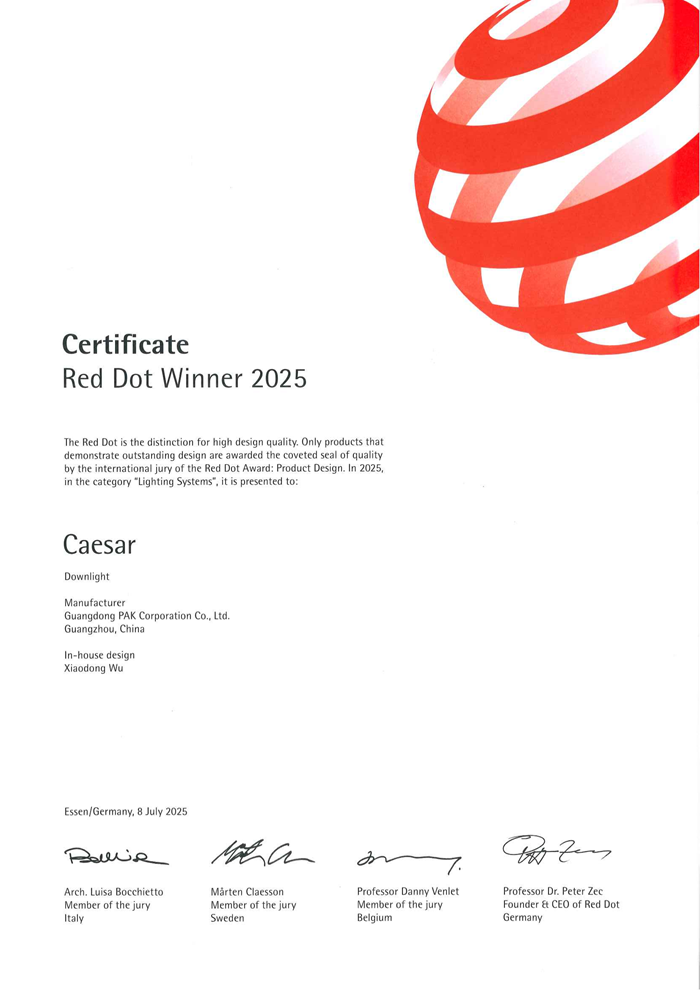 近日,2025年德國紅點設計大獎榜單全球發布。三雄極光旗下高端品牌鉑刻照明(pollcca)憑借凱撒系列筒燈(Caesar Downlight) 成功金榜題名,榮獲產品設計類大獎,展現出中國照明設計的卓越水準與國際認可。