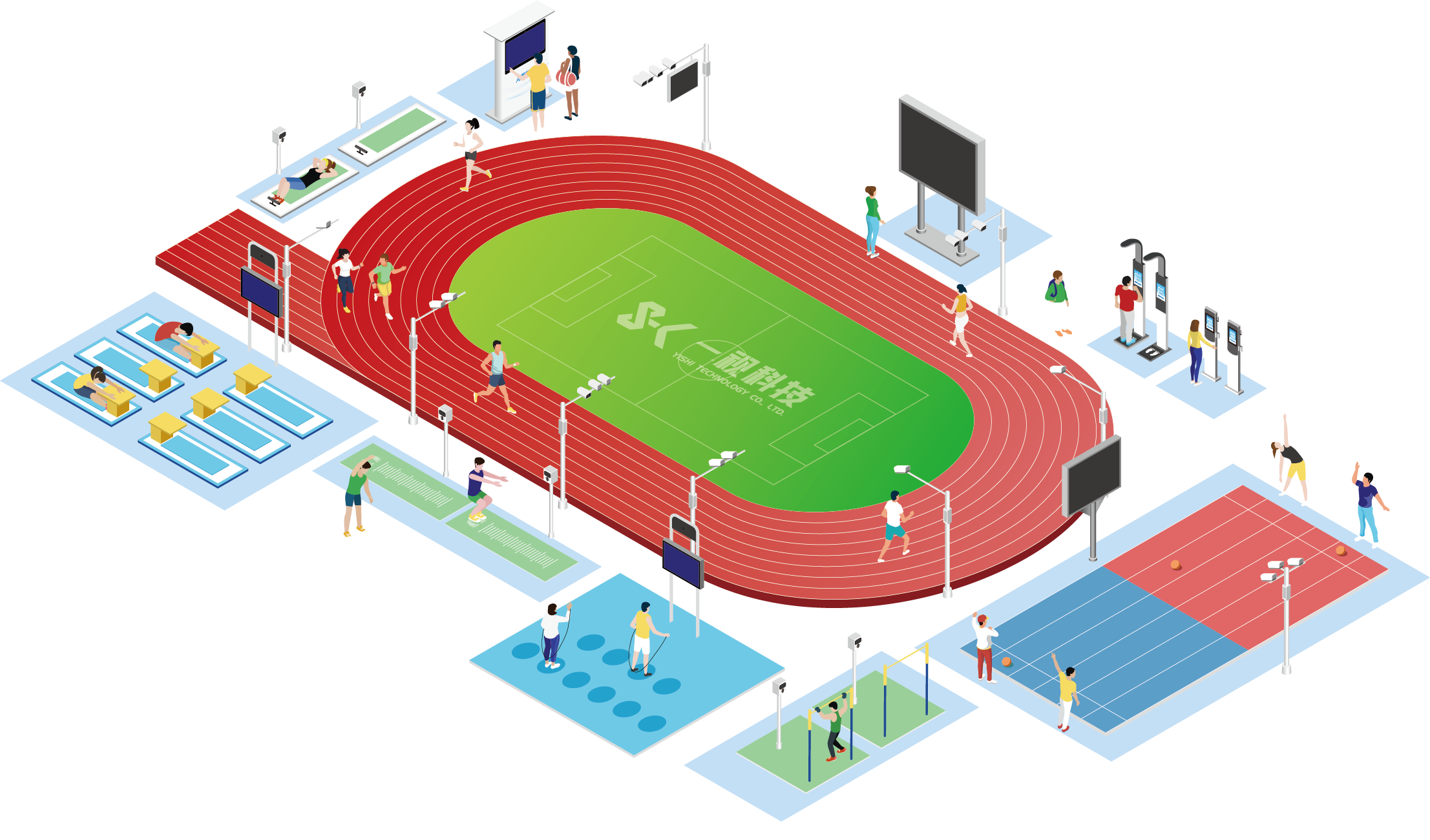 通過物聯網攝像頭+人工智能運動視覺算法,實施操場及運動場地的智能化改造,在跳遠、跑步等運動區域裝上攝像頭“眼睛”、人工智能“大腦”和語音交互“嘴巴”,能夠實時識別學生的體育活動,提供即時反饋和指導,實現學生體育科學化訓練、個性化教學、規模化測試以及標準化體育中考,覆蓋“教學練測評”全場景應用,為體育課“提趣提質”,全面服務體育強國戰略。