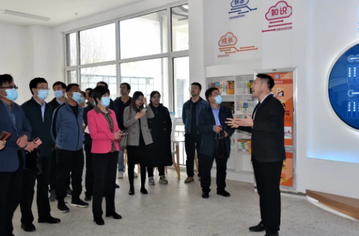楊世臣校長(zhǎng)引領(lǐng)曾俊萍局長(zhǎng)一行參觀教學(xué)樓內(nèi)特色布局。
