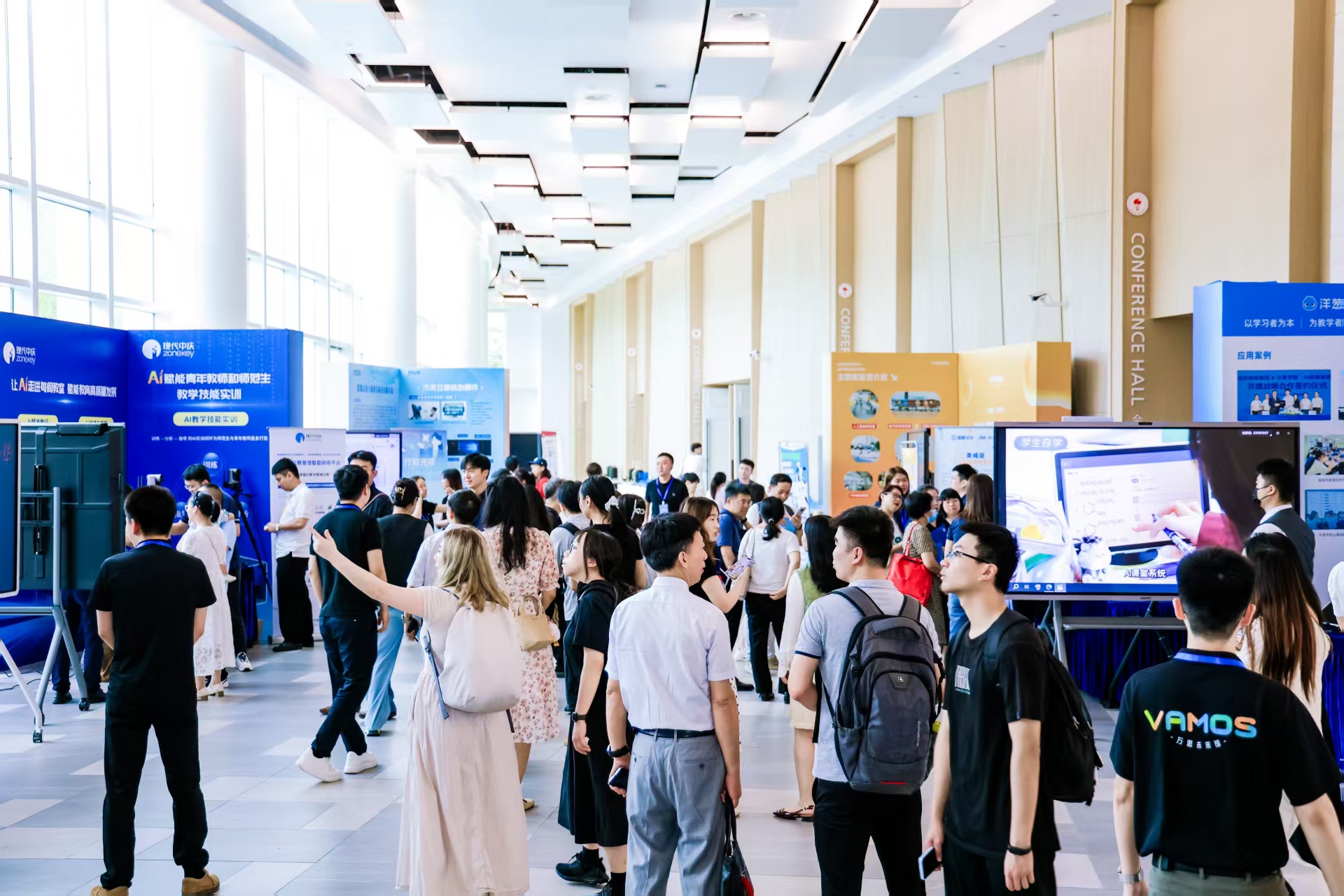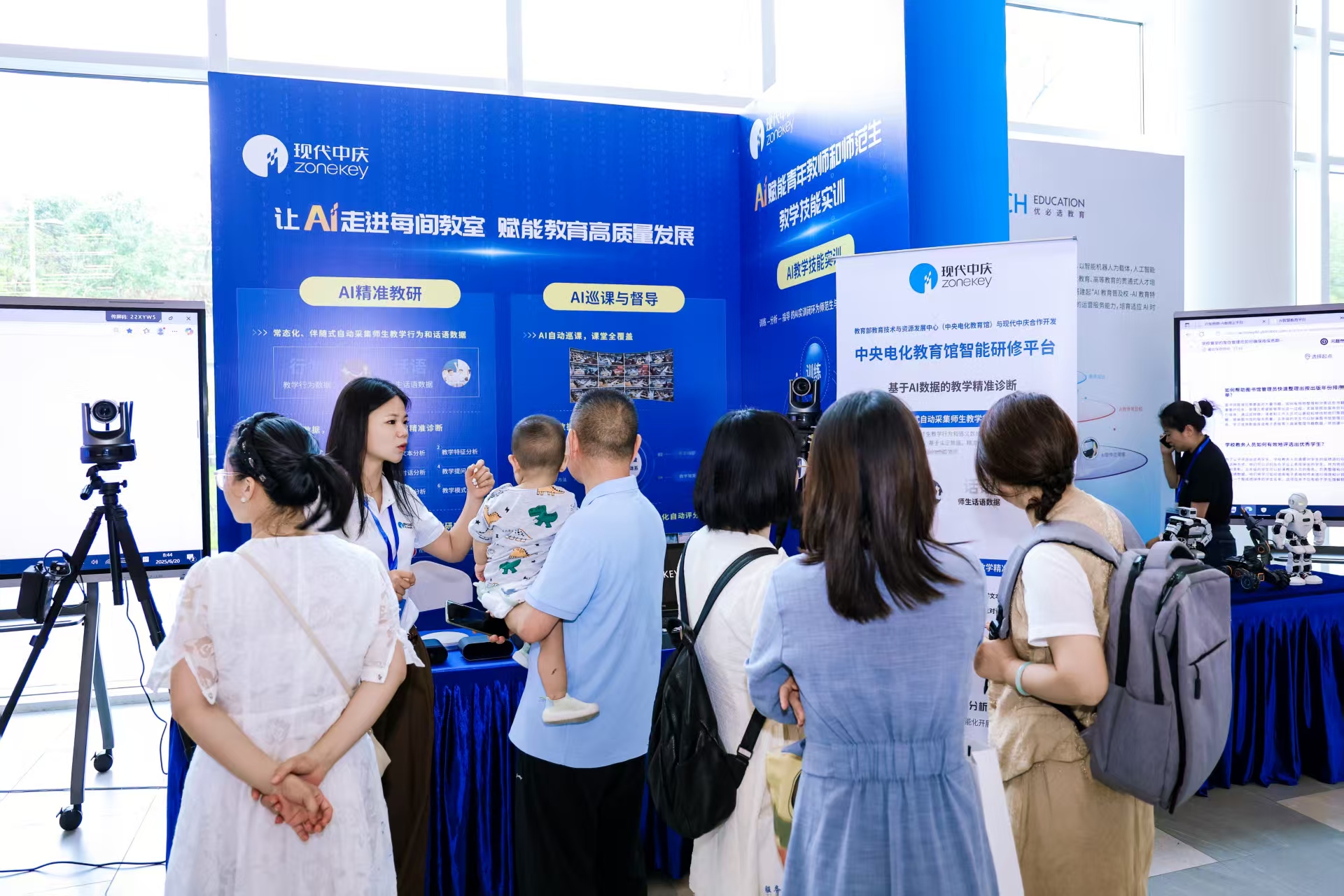 研討會(huì)期間,同時(shí)舉辦的“智能科技教育裝備展”,旨在為參會(huì)者提供一個(gè)直觀、沉浸、互動(dòng)的AI教育場(chǎng)景體驗(yàn)平臺(tái)。現(xiàn)代中慶展出了多個(gè)教育AI應(yīng)用方案。包括AI精準(zhǔn)教研,AI巡課與督導(dǎo),AI教學(xué)技能實(shí)訓(xùn)等,讓與會(huì)嘉賓沉浸式體驗(yàn)了AI賦能下教師專業(yè)成長(zhǎng)和教學(xué)質(zhì)量管理范式的數(shù)字化轉(zhuǎn)變。