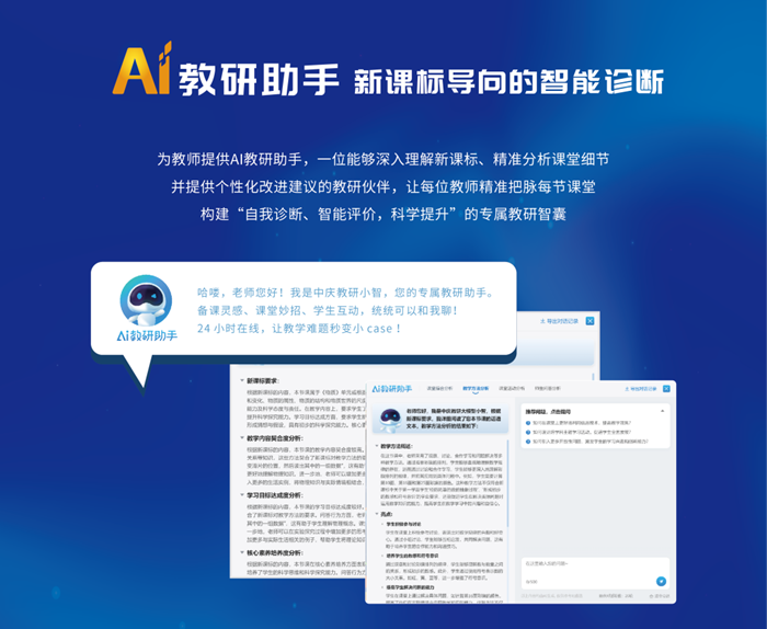 AI教研成為關注焦點。現代中慶AI智能終端通過人工智能技術,融合教育大模型,全景式感知課堂教學中20類教學體征、140項教學數據,精準捕捉師生教學行為和語義互動,實時解構課堂教學場景,幫助教師更好地反思課堂教學的實施情況,為課堂評價、課堂診斷和教研活動開展提供精準顯微的實證數據支持。