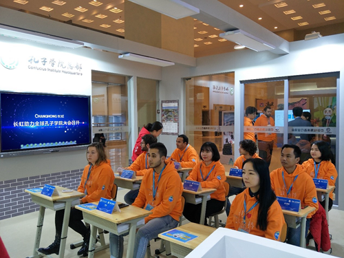 2月4日,第十三屆全球孔子學院大會在成都開幕,來自150多個國家和地區(qū)的大學校長、孔子學院代表近1500人參加大會,共話漢語海外教學和文化交流。長虹助力全球孔子學院大會,為第十三屆全球孔子學院大會送了一份別樣的禮物—孔子學院全球首間智慧教室,受到了現(xiàn)場中外大學校長、孔子學院代表的一致好評。