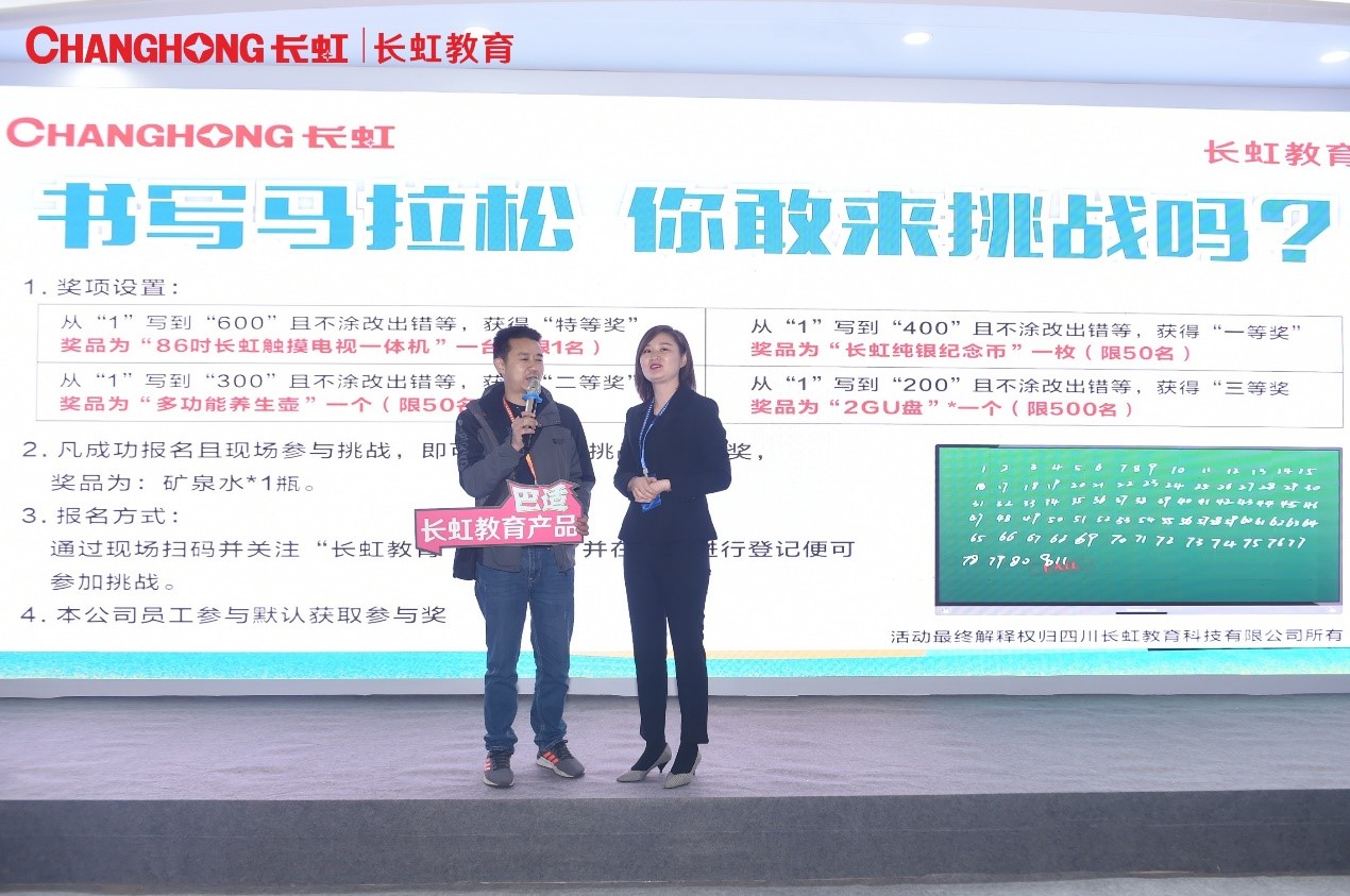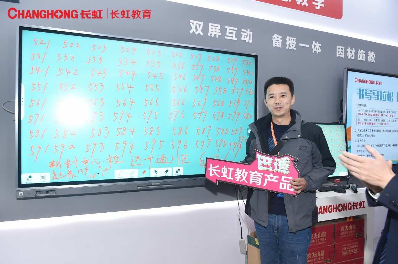 今天是2019年首屆四川教育裝備博覽會(huì)第二天,長(zhǎng)虹教育展位人聲鼎沸。在展會(huì)現(xiàn)場(chǎng),長(zhǎng)虹教育舉辦的“長(zhǎng)虹教育書寫馬拉松,你敢來(lái)挑戰(zhàn)嗎?”長(zhǎng)虹教育智能觸摸一體機(jī)書寫大賽,參加報(bào)名和挑戰(zhàn)的用戶門庭若市,絡(luò)繹不絕。最最最最重要的是,來(lái)自四川達(dá)州市通川區(qū)的趙老師獲得了書寫大賽特等獎(jiǎng)-長(zhǎng)虹教育86吋智能觸摸一體機(jī)1臺(tái)。