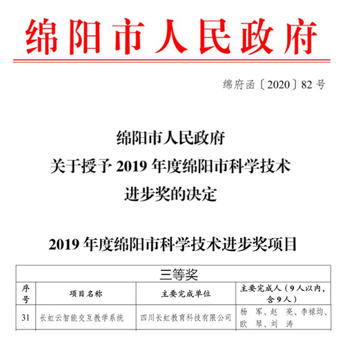 近日,綿陽市人民政府發(fā)布《關于授予2019年度綿陽市科學技術進步獎的決定》,長虹教育的“長虹云智能交互教學系統(tǒng)項目”研究成果被授予2019年度綿陽市科學技術進步獎三等獎。