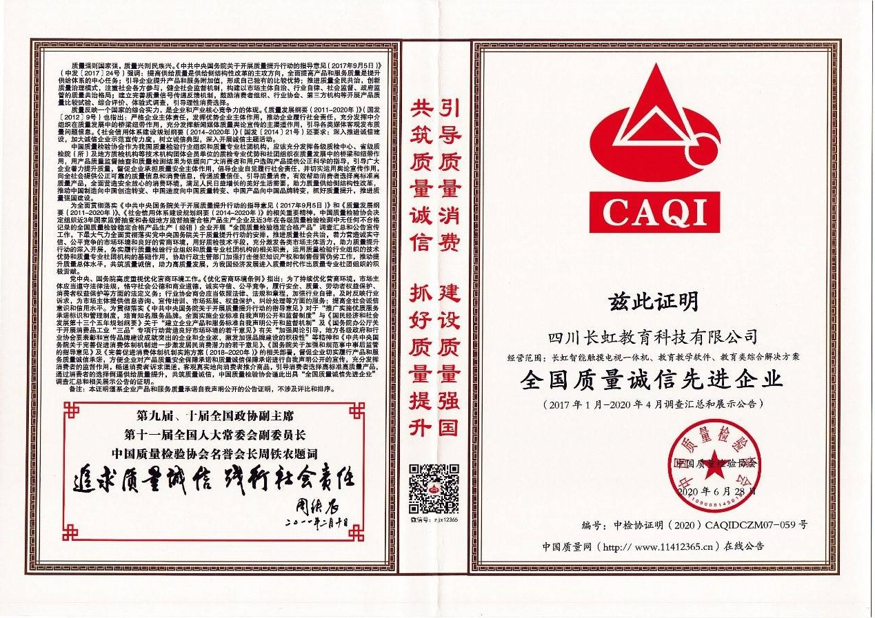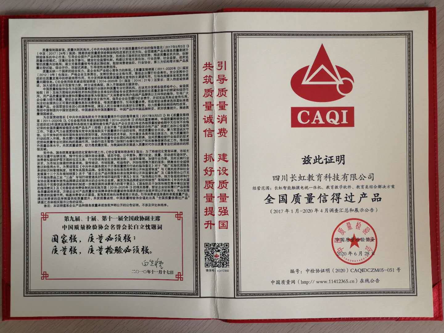 近日,從中國質(zhì)量檢驗協(xié)會獲悉,由國家市場監(jiān)管總局、中宣部、發(fā)改委、教育部、科技部、工業(yè)和信息化部、環(huán)境保護部等47個相關(guān)部門聯(lián)合行業(yè)協(xié)會共同主辦的2020年全國質(zhì)量月活動,長虹教育科技憑借過硬的產(chǎn)品品質(zhì)、誠信的企業(yè)經(jīng)營再次榮獲“全國教育裝備行業(yè)質(zhì)量領(lǐng)先品牌”、“2020全國質(zhì)量誠信先進企業(yè)”、“全國質(zhì)量信得過產(chǎn)品”三項國家質(zhì)量大獎。