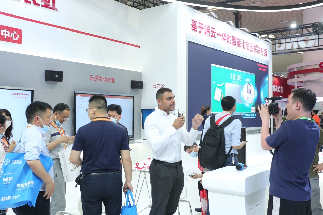 4月25日,為期三天的國內教育裝備行業規模最大、影響最廣的年度盛會——第79屆中國教育裝備展示會在廈門圓滿落下帷幕。長虹教育科技為現場觀眾獻上了一道道豐盛的新建學校整體方案的菜肴——基于端云一體機的智能化校園、云智能校園體驗中心、智慧課堂、小組研討教室、數字孿生應用,現場還有舉行了多場抽獎活動,長虹教育科技的展位人流絡繹不絕,現場氛圍熱烈。本次展會上,中文聯盟的海外留學生朋友使用中英雙語向全球推介長虹教育科技的產品方案。