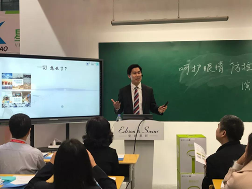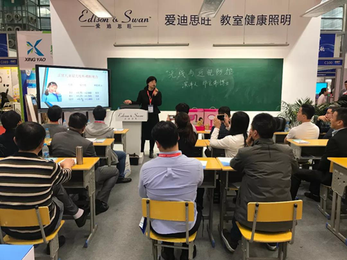 浙江大學附屬第二醫院眼科中心視光部主任、全國兒童近視防控公益科普領頭人、《孩子的護眼寶典》合著者之一倪海龍醫生,也專程從杭州趕來“愛迪思旺”教室健康照明的展位,就《呵護眼睛、防控近視、光明未來》的主題進行了宣講,也提請家長注意學習光環境,尤其是學校教室的學習光環境對孩子眼健康的影響。