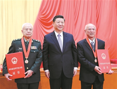 1月8日,2018年度國家科學技術獎勵大會在北京人民大會堂隆重舉行。中共中央總書記、國家主席、中央軍委主席習近平向獲得2018年度國家最高科學技術獎的哈爾濱工業(yè)大學劉永坦院士(右)和中國人民解放軍陸軍工程大學錢七虎院士(左)頒獎。 新華社記者 謝環(huán)馳 攝