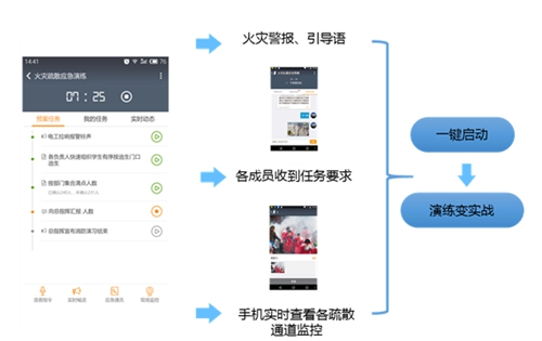 事中控制:學(xué)安體系在事故發(fā)生中,保衛(wèi)室或者校領(lǐng)導(dǎo)在視頻監(jiān)控中發(fā)現(xiàn)異常,可通過手機客戶端一鍵啟動應(yīng)急預(yù)案,師生及時獲取緊急事故情況,及時自救逃生;