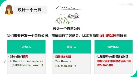 本課的語言能力目標是使學生能夠靈活運用本課重點句型“Is there……” 。因此,為了激起同學們的興趣,教師以設計自然公園為任務進行課堂分組。學生以六人為一組,分角色扮演“市長”、“記者”以及“設計師”,在小組討論學習中通過運用句型“Is there……in the park?”完成自然公園的設計(口語輸出)和介紹(寫作輸出)。