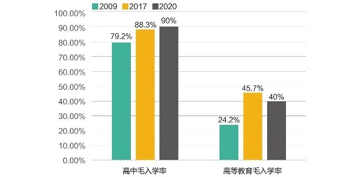 反觀2009年這四個數值分別為79.2%,24.2%,9.5年,12.4年,2017年底統計數為88.3%,45.7%,10.5年,13.3年。其中高等教育毛入學率已經提前完成,新增勞動力平均受教育年限也已接近目標。全國共有普通高等學校2631所,在學總規模達到3779萬人,在校生已經連續五年全球第一。
