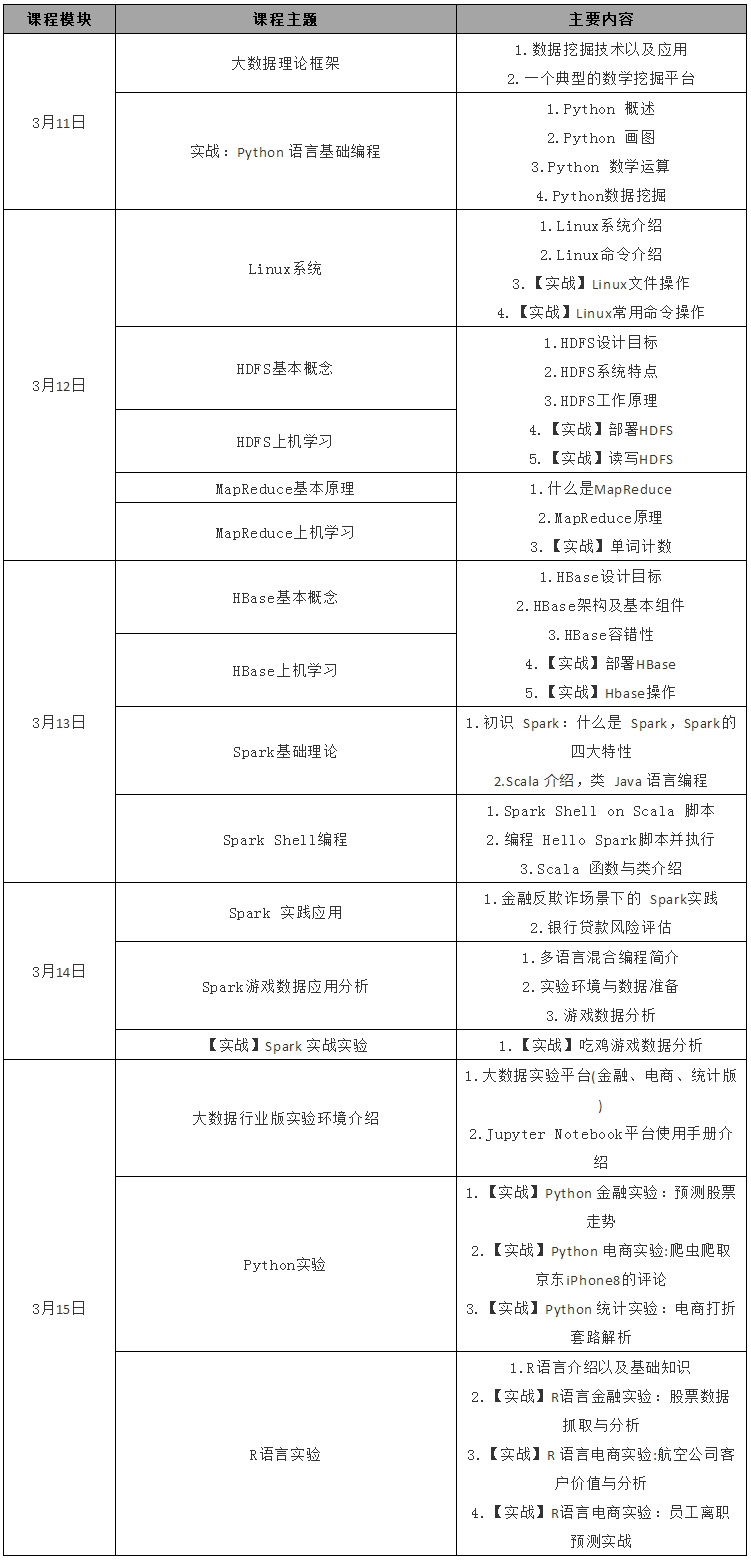 課堂沒有冗長乏味的理論講授,而是通過密集的高強度實戰課程,帶領學員克服大數據能力提升中各階段的典型痛點和難點:幫助每位參訓學員跑通每一項實驗,讓學員能學到真本事;幫助院校教師開拓課程開設思路;幫助學生解決畢業就業面臨的實戰能力問題;幫助科研人員打磨科研方向等。您不需基礎,就可以直接動手實驗,更重要的是,通過參加本次培訓,再加以自學,可實現學員在理論和實踐、培訓和自學之間的輕松轉換。具體培訓大綱如下: