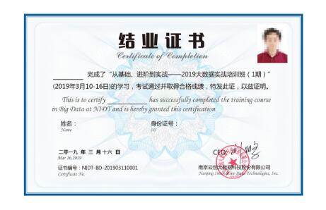 【可選】由知名的Silicon Stone Education(SSE,硅石教育集團)頒發的國際大數據人才認證證書(需要通過在線考試,學員可在報到時選擇是否進行證書考試報名,報名的學員將按照900元/人繳納證書工本費,并在考試合格后獲得證書)。