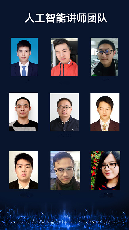 人工智能講師團隊成員畢業于知名高校,均為負責人工智能實驗平臺、智慧路燈伴侶等平臺開發的技術骨干,覆蓋人臉識別、車輛識別、智能交通信號控制、前列腺癌病理圖像診斷算法、宮頸癌初篩診斷、PM2.5預測、地震波形識別等項目,有著豐富的算法研究、模型訓練等人工智能經驗。