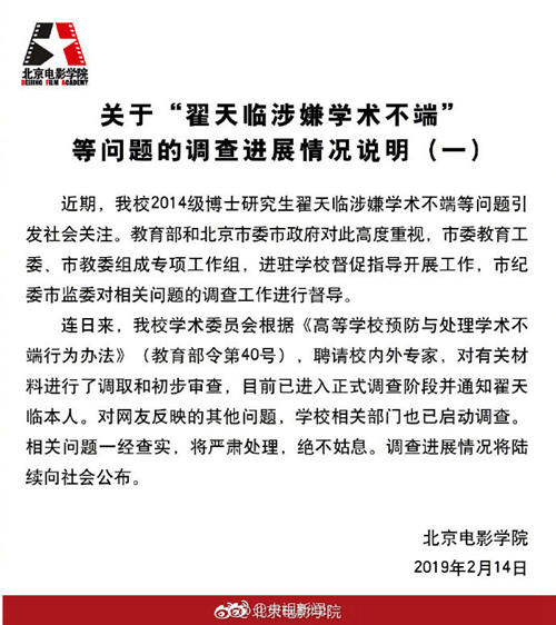 北京電影學院公布翟天臨事件調查最新進展