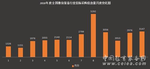 根據2018年度全國教育裝備招標采購信息量月度變化圖(見圖6)能夠看出:8月份的招標信息量最高,3、4、5、6月份波動平緩,9、11、12月份招標信息量整體持平,1、2月份招標信息量整體最低。