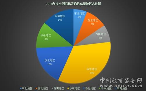 從地區上來看全國教育裝備招標采購信息量,根據2018年全國教育裝備招標采購信息量地區統計圖(見圖8)和占比圖(見圖9)我們發現,占據最大份額的是華東地區,其招標采購信息量10015條,占全部信息量的34%;華北地區招標采購信息量以5247條,占全部信息量的18%,位列第二;華南地區招標采購信息量以4222條,占全部信息量的14%,位列第三;華中地區招標采購信息量以3439條,占全部信息量的11%,位列第四;西北地區招標采購信息量以2821條,占全部信息量的9%,位列第五;西南地區招標采購信息量以2275條,占全部信息量的8%,位列第六;東北地區招標采購信息量以1786條,占全部信息量的6%,排在末位。