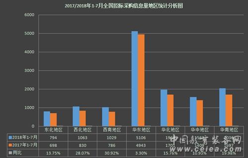 另外,從2017/2018年1~7月全國教育裝備招標采購信息量地區統計分析圖(見圖10)上可以看出:東北地區招標采購信息量為794條,同比增長13.75%;西北地區招標采購信息量為1063條,同比增長28.07%;西南地區招標采購信息量為1029條,同比增長30.92%;華東地區招標采購信息量為5106條,同比增長3.30%;華北地區招標采購信息量為1969條,同比增長15.76%;華中地區招標采購信息量為1563條,同比增長10.93%;華南地區招標采購信息量為2036條,同比增長19.98%。