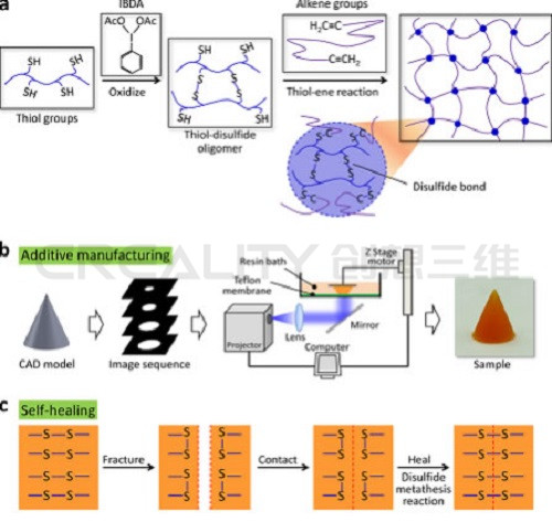 摘要寫道:“自我修復和3D塑形方面都表現出色;例如,可自行修復的人體器官具有功能幾何形狀和微觀結構。然而,將人造自愈材料定制為復雜結構將面臨重大挑戰。在這里,我們報告了一種基于光聚合的添加劑制造的自由形態結構的自粘彈性體結構的范例。該范例依賴于分子設計的具有硫醇和二硫化物基團的光彈性體油墨,其中前者在3D打印過程中促進烯光聚合,后者在自愈過程中實現二硫化物復分解反應。”