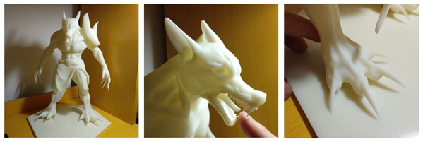 1、動漫手辦:3D打印狼人模型,湖南大學生畢業(yè)設計作品。該模型以0.1mm層厚打印耗時約20h左右,而最終成品精細度遠超過預期,牙齒、爪尖等細節(jié)表現(xiàn)尤為精細。