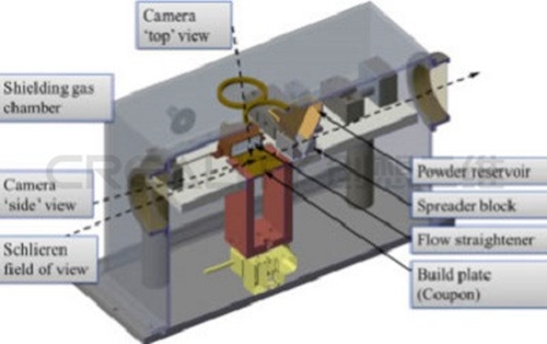 開(kāi)放式架構(gòu)PBF系統(tǒng)的示意圖,其中包括對(duì)高速成像和紋影成像的修改。科學(xué)家們使用開(kāi)放式結(jié)構(gòu)PBF系統(tǒng)進(jìn)行現(xiàn)場(chǎng)測(cè)量,提供完全密集組件的自動(dòng)構(gòu)建。電腦提供了構(gòu)建板在層之間的垂直移動(dòng)、硅繩粉末涂布機(jī)的運(yùn)動(dòng)、激光照射和掃描和靈活性可用于激光功率和速度。
