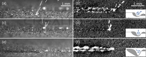 使用激光功率掃描單個(gè)軌道(從左到右掃描方向)時(shí)的側(cè)視圖和俯視圖的高速圖像,掃描速度為(a)和(b)50 W和0.1 m / s; (c)和(d)100W和0.5m / s以及(e)和(f)200W和1m / s。插圖是熔池形狀的示意圖,其決定了激光羽流方向。所有數(shù)字的視頻都包含在補(bǔ)充材料中。
