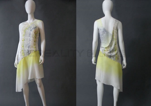 第二個是 Sun為這項研究所采取的路線,其重點是“視覺幻覺的靈感”。太陽融合了有機形式,融合在一起看起來像蕾絲,在原型服裝中,具有精致的軀干和裙子部分,這款喇叭形真絲半身裙采用不對稱下擺設計。這件連衣裙的軀干部分融合了兩個數字設計應用,內襯絲綢電力紡,作為最基本的平紋真絲織物之一,并且不需要拉鏈形式的額外封口。