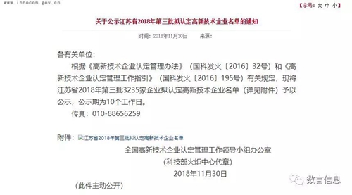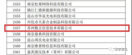 2018年11月30日,高新技術企業認定管理工作網公示江蘇省第三批3235家企業擬認定高新技術企業名單。蘇州數言信息技術有限公司榜上有名,被認定為高新技術企業。
