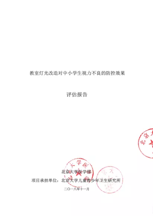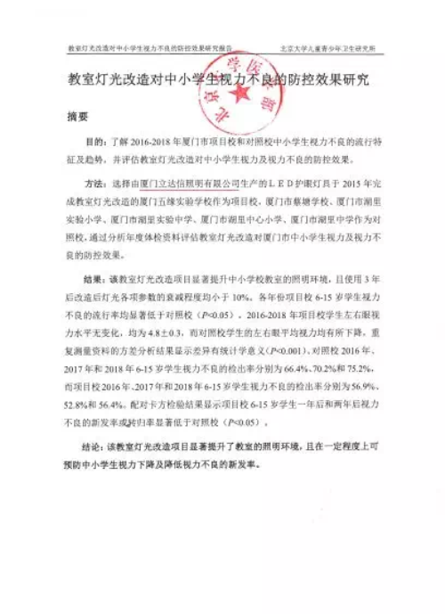 由北京大學(xué)醫(yī)學(xué)部、北京大學(xué)兒童青少年衛(wèi)生研究所出具的評估報告《教室燈光改造對中小學(xué)生近視不良的防控效果》顯示:立達信改造項目顯著提升了教室的照明環(huán)境,在一定程度上可預(yù)防中小學(xué)生視力下降及降低視力不良的新發(fā)率。