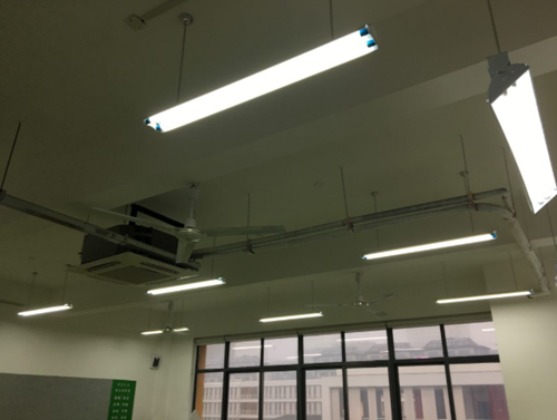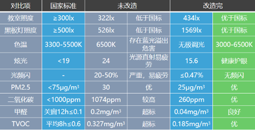 改造前,學校配備的是傳統熒光燈,因為燈具本身的缺陷,造成光衰嚴重,教室桌面照度不足,且存在頻閃、顯色性差、眩光、能耗高等問題。不僅如此,教室內使用的仍然是吊扇,存在一定的安全隱患。