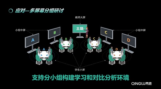 在多屏研討的教學(xué)場景下,教師通過課堂分組,實現(xiàn)學(xué)生-小組-課堂之間的實時互動,讓每個小組成員自由分享學(xué)習(xí)成果,構(gòu)建小組探究、自主學(xué)習(xí)的智慧學(xué)習(xí)環(huán)境。