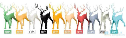 光固化3D打印機(jī)使用液態(tài)光敏樹脂,以及一些工業(yè)用途特種樹脂,例如失蠟鑄造用樹脂蠟、牙科專用樹脂、耐熱或柔性樹脂。光固化3D打印機(jī)耗材顏色選擇有限,創(chuàng)想三維暫時(shí)最多僅可提供十種。