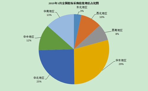從3月招標采購信息地區統計圖(如圖3所示)和全國招標采購信息量地區占比圖(如圖4所示)來看:華東地區招標采購信息量為803條,占比29%;華北地區招標采購信息量為684條,占比25%;華南地區招標信息采購量為372條,占比13%;華中地區招標采購信息量為331條,占比12%;西北地區招標采購信息量為268條,占比10%;西南地區招標采購信息量為210條,占比8%;東北地區招標采購信息量為95條,占比3%。