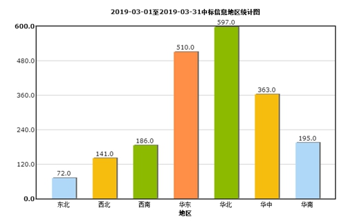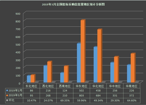 綜合3月全國招標采購信息量地區統計分析圖(如圖5所示):西南地區環比增長69.35%;華南地區環比增長64.60%;華東地區環比增長59.96%;華北地區環比增長49.34%;華中地區環比增長29.30%;西北地區環比增長24.07%;東北地區環比增長10.47%。