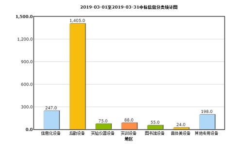 從3月份各類別教育裝備招標采購信息量分析圖中(如圖2所示)可以看出:后勤設備招標采購信息環比增長43.11%;實驗儀器設備招標采購信息環比增長46.61%;信息化設備招標采購信息環比增長72.73%;實訓設備招標采購信息環比增長58.11%;圖書館設備招標采購信息環比增長36.54%;音體美設備招標采購信息環比增長208.33%;;其他設備招標采購信息環比增長48.35%。