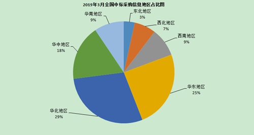從3月中標信息地區統計圖(如圖8所示)和全國中標信息地區占比圖(如圖9所示)來看:華北地區中標信息量為597條,占比29%;華東地區中標信息量為510條,占比25%;華中地區中標信息量為363條,占比18%;華南地區中標信息量為195條,占比9%;西南地區招中標信息量為186條,占比9%;西北地區中標信息量為141條,占比7%;東北地區中標信息量為72條,占比3%。
