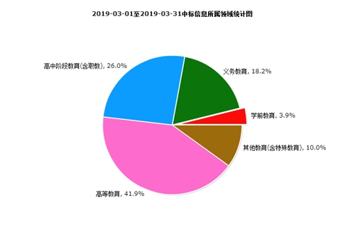 3月中標信息所屬領域統計圖,如圖10所示:學前教育占比為3.9%;義務教育占比為18.2%;高中階段教育(含職教)占比為26.0%;高等教育占比為41.9%;其他教育(含特殊教育)占比為10.0%。