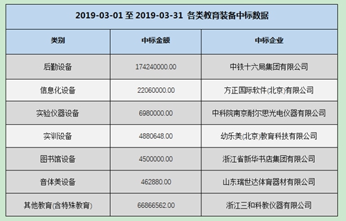附:2019年3月已有教育裝備類別數據中累積最高中標金額及其所屬企業。