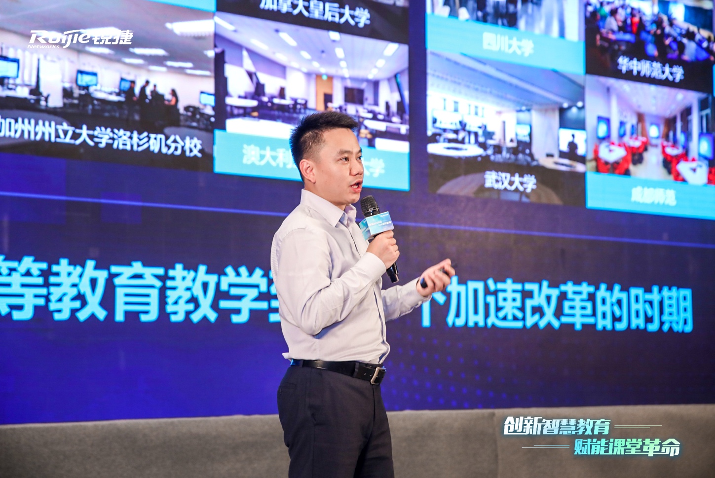 作為人才培養的支點,“課堂”的技術和空間變革是擺在教育工作者面前的一個問題。對此,銳捷網絡高職教行業部總經理蔡志華在題為“銳捷網絡與智慧教室”的匯報中談到,“銳捷服務教育十九年,帶著對教育的深刻理解和對教學場景需求的精準挖掘,在當前教育改革轉向以課堂為主戰場的大背景下,銳捷也從基礎網絡延伸到教育教學,開始進入智慧教學領域,為高校提供更深層次的服務。