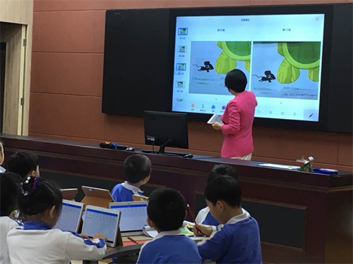 在新安中學外國語學校,來自二年級的英語老師曾珊娜和一年級的語文老師張斯琪分別帶了一堂別開生面的《a girl and three bears》和《棉花姑娘》課,淋漓盡致地展示了信息技術與課堂教學的高度融合。在英語課堂上,幾道英語隨堂測驗題完成后,優秀率、答題情況等,即時出現在老師屏幕上,曾老師對學生的知識掌握情況一目了然,明確學生問題較多的地方,進而確定課堂的重難點,切實做到了因材施教。在另一堂語文課上,學生在平板上獨自完成練習,張老師即時展示學生的作答情況,其余學生通過投票形式給學生點贊,通過系統的點名功能和投票功能,增強了師生互動性,提升了班級小組之間的競爭氛圍。課后,現場老師們也紛紛對這種新型的教育信息化智慧課堂給予了充分認可。