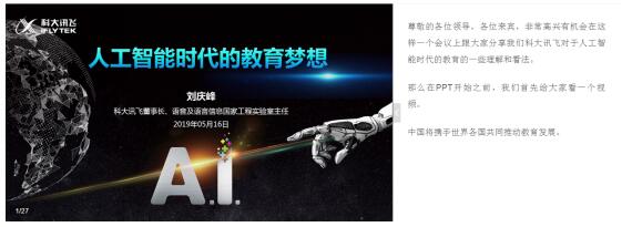 此次人工智能與教育大會集中向國際社會展示了我國對未來教育發展的思考和戰略部署,分享我國在教育信息化和人工智能技術應用于教育領域的經驗。科大訊飛的技術和應用獲得了國內外領導、嘉賓的高度認可。未來,科大訊飛將持續加大人工智能核心技術在教育領域的應用,并推動智慧教育生態體系的構建,共同推動教育更加公平而有質量的發展。