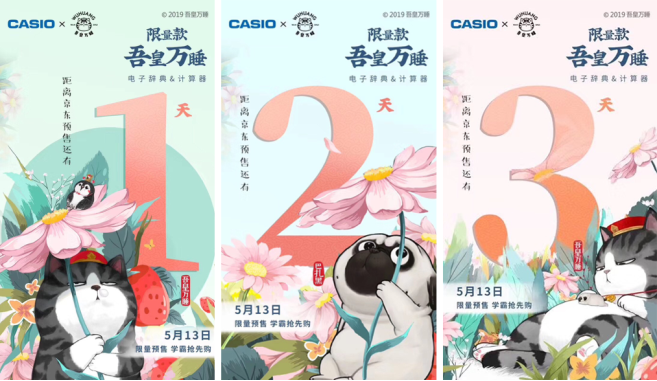 卡西歐作為電子產業的先驅品牌代表之一,一直致力于中國教育事業,公司經營理念是創造·貢獻,無論產品與營銷都緊跟時代,滿足用戶個性化需求,在營銷層面也不斷嘗試以創新的形式與年輕消費者進行溝通,本次卡西歐旗下教育產品計算器和電子辭典將在5月20日正式發售卡西歐X吾皇萬睡限量款產品,也是將萌寵文化轉化為經濟的一次重要突破,借助IP,為產品賦能。