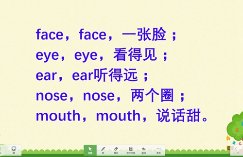 小孩子天性活潑,喜歡有韻律、有節(jié)奏的 chant(頌歌)。PEP 教材三年級(jí)英語課本中,每單元都有對(duì)應(yīng)的 chant。我利用從網(wǎng)上下載的配套動(dòng)畫,帶領(lǐng)孩子們一邊吟誦 chant,一邊拍手打節(jié)奏,孩子們不知不覺就將本單元所學(xué)知識(shí)串聯(lián)并背誦下來了。例如,在學(xué)習(xí)三年級(jí)上冊(cè)第三單元時(shí),我自創(chuàng)的 chant“face,face, 一 張臉;eye,eye, 看 得 見;ear,ear, 聽 得 遠(yuǎn);nose,nose, 兩 個(gè) 圈;mouth,mouth,說話甜。”深受學(xué)生喜愛。學(xué)生在吟誦過程中,自己就配上動(dòng)作,指著對(duì)應(yīng)的身體部位,既讀熟了單詞,又利用情景學(xué)習(xí)法加深了對(duì)單詞的記憶。這節(jié)課獲得了沙河鄉(xiāng)優(yōu)質(zhì)課競(jìng)賽評(píng)委們的一致好評(píng)。