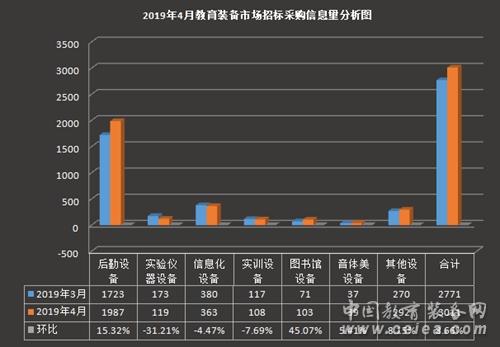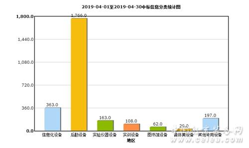 通過上述數(shù)據(jù)可知,4月份后勤設備、圖書館設備、音體美及其他設備均繼續(xù)呈增長趨勢,其中,圖書館設備環(huán)比增長明顯,而實驗儀器設備、信息化設備以及實訓設備則有不同程度的下降,實驗儀器設備下降幅度較大。