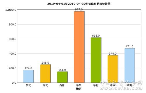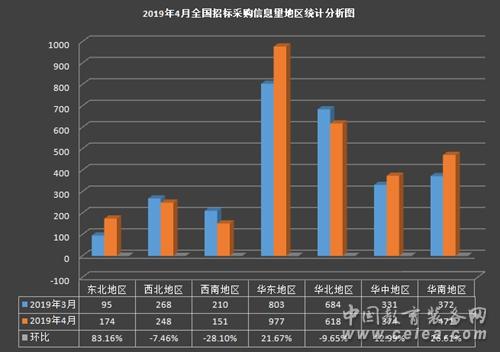 綜合4月全國招標采購信息量地區(qū)統(tǒng)計分析圖(如圖5所示):東北地區(qū)環(huán)比增長83.16%;華南地區(qū)環(huán)比增長26.61%;華東地區(qū)環(huán)比增長21.67%;華中地區(qū)環(huán)比增長12.99%;西南地區(qū)環(huán)比下降28.10%;華北地區(qū)環(huán)比下降9.65%;西北地區(qū)環(huán)比下降7.46%。