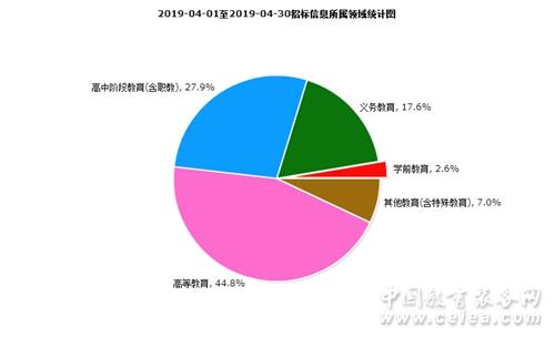 從4月招標采購信息所屬領域統(tǒng)計圖(如圖6所示)上看,學前教育占比為2.6%;義務教育占比為17.6%;高中階段教育(含職教)占比為27.9%;高等教育占比為44.8%;其他教育(含特殊教育)占比為7.0%。