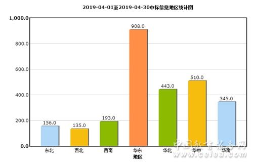從4月中標信息地區(qū)統(tǒng)計圖(如圖8所示)和全國中標信息地區(qū)占比圖(如圖9所示)來看:華東地區(qū)中標信息量為908條,占比34%;華中地區(qū)中標信息量為510條,占比19%;華北地區(qū)中標信息量為443條,占比16%;華南地區(qū)中標信息量為345條,占比13%;西南地區(qū)招中標信息量為193條,占比7%;東北地區(qū)中標信息量為156條,占比6%;西北地區(qū)中標信息量為135條,占比5%。