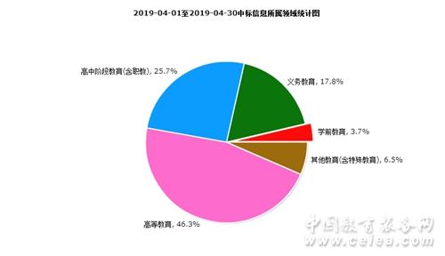 4月中標信息所屬領域統(tǒng)計圖,如圖10所示:學前教育占比為3.7%;義務教育占比為17.8%;高中階段教育(含職教)占比為25.7%;高等教育占比為46.3%;其他教育(含特殊教育)占比為6.5%。
