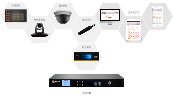 本方案由智慧黑板、互動錄播主機、高清攝像機、專業(yè)音頻設備、資源平臺等產品組成。