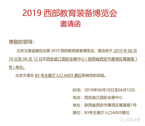 北京文香受邀參加2019西北教育裝備博覽會,會議將于2019年6月10日-12日在西安曲江國際會展中心舉行,北京文香將攜超強陣容亮相本次展會,敬請期待。